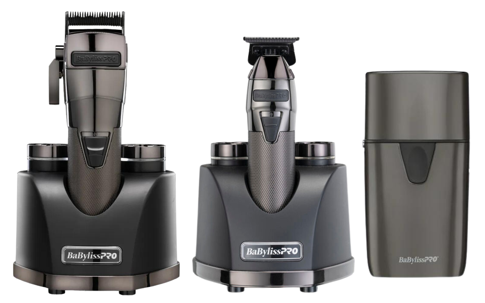 Лучшие инструменты в линейке BaBylissPRO в цвете gunsteel - машинка, триммер и шейвер с ультрафиолетовой дезинфекцией.