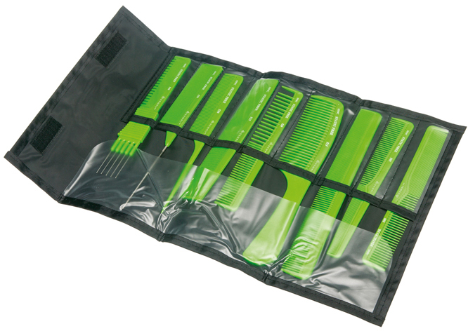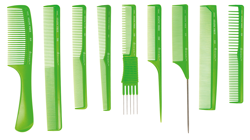 Набор расчёсок разнообразных форм. В комплекте есть все необходимые модели для укладки, окрашивания и стрижки волос. Расчески изготовлены из высококачественного пластика. Закругленные зубья не повреждают волосы и не травмируют кожу головы.