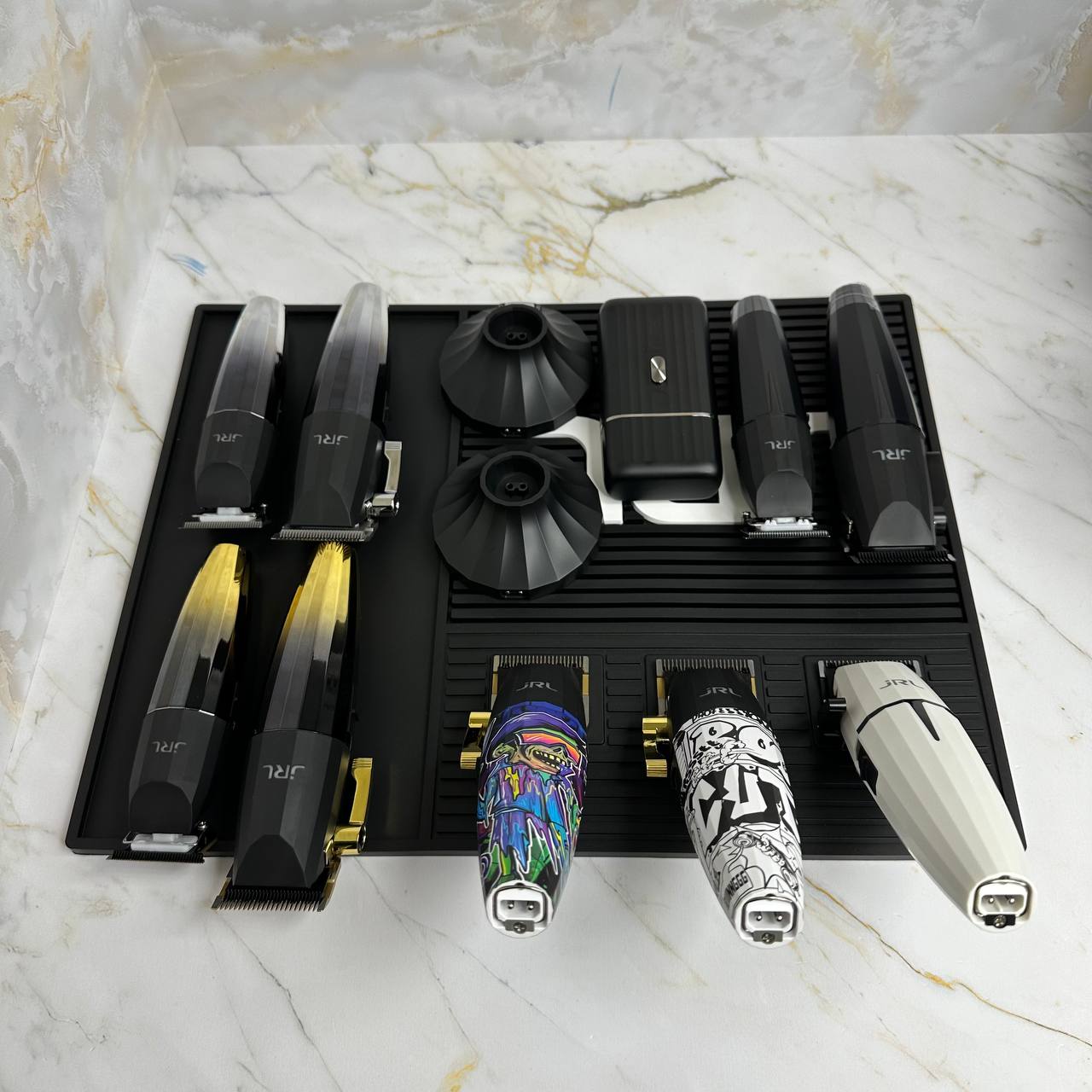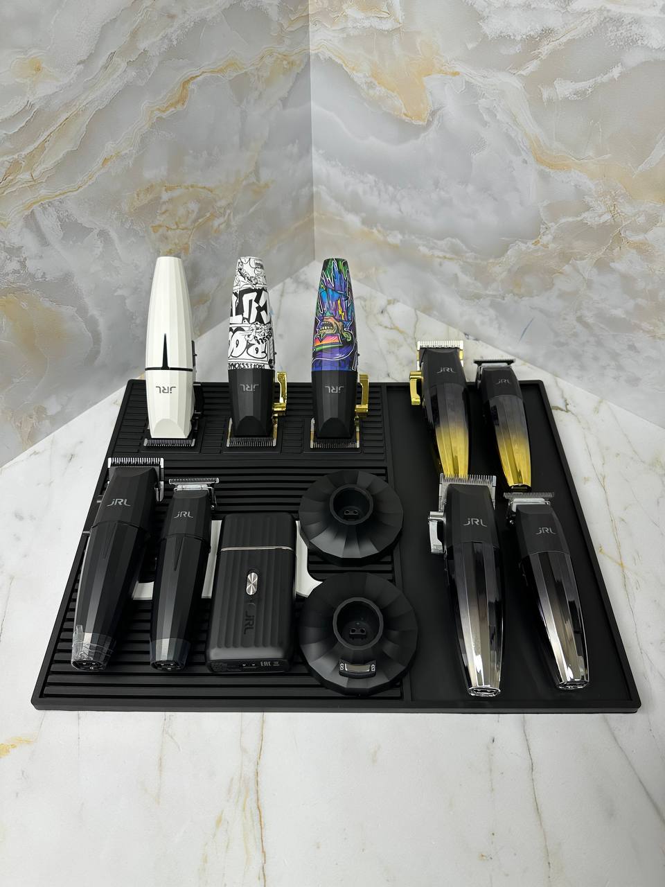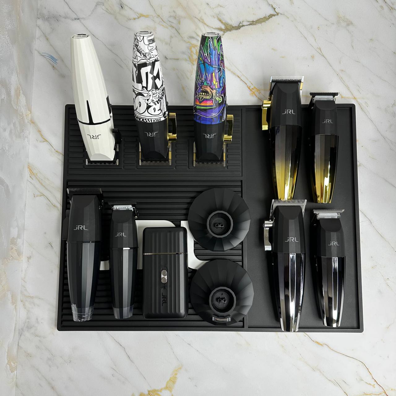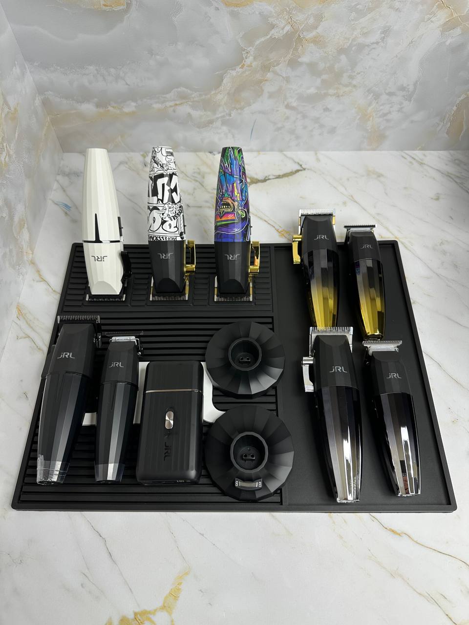 Термостойкий силиконовый коврик от бренда jRL Professional с 3 сильными магнитами для крепления машинок и триммеров. Термостойкость до 360 градусов.