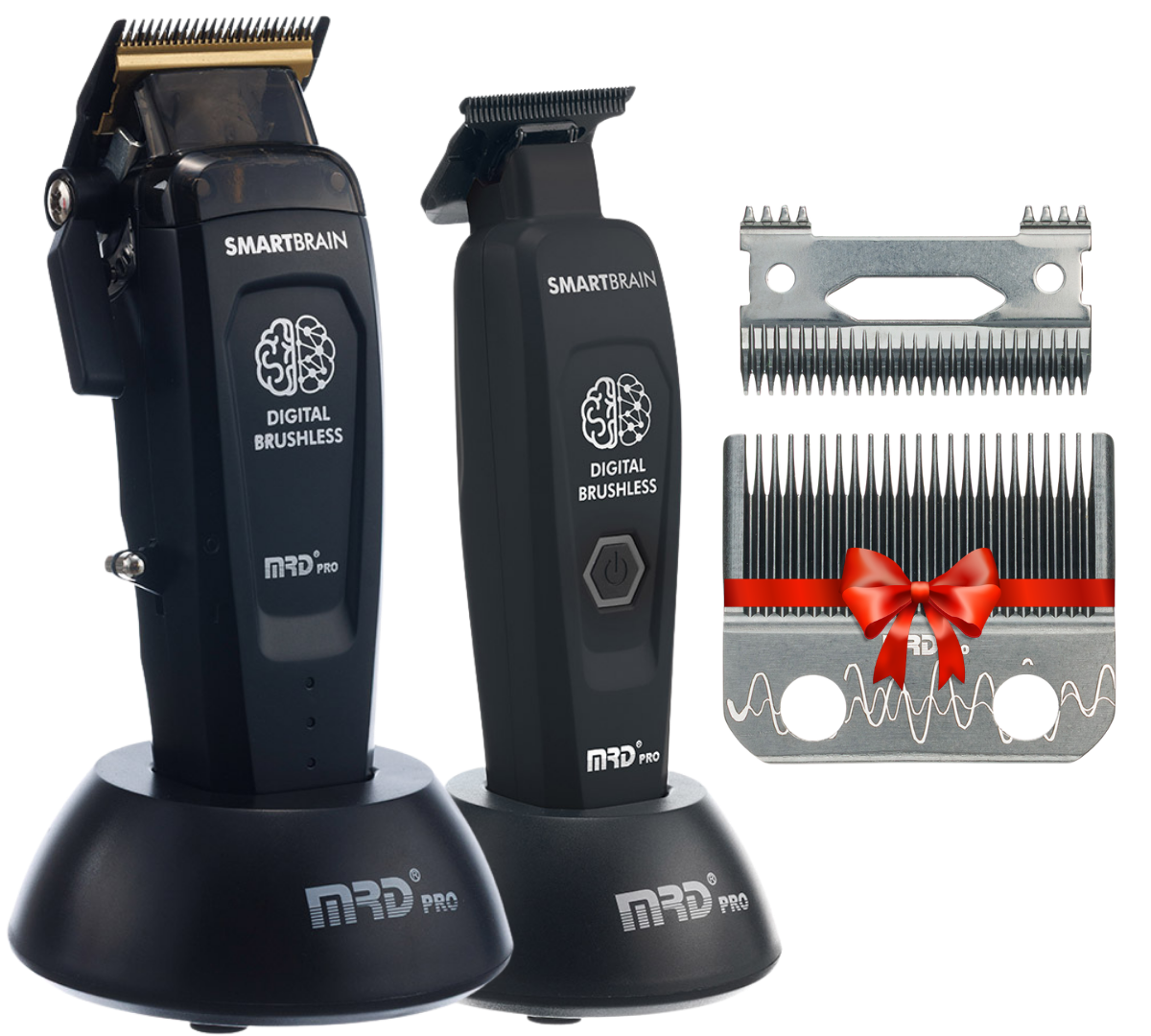 Набор из машинки и триммера MRD Pro серии 90-4: машинка с бесщеточным мотором, ножами из японской стали с низким уровнем нагрева, японскими комплектующие, а также надежный триммер с четким срезом.