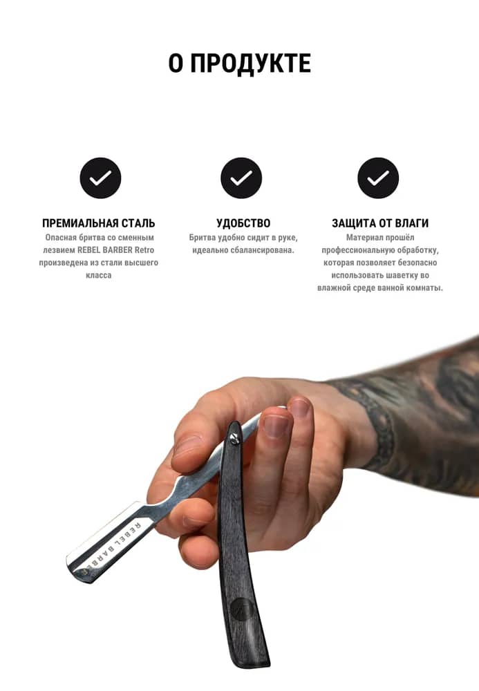 Шавет REBEL BARBER - это прекрасно разработанный, незаменимый инструмент для желающих действительно испытать удовольствие от традиционного влажного бритья. Удобно сидит в руке, идеально сбалансирована. Для домашнего и профессионального использования.