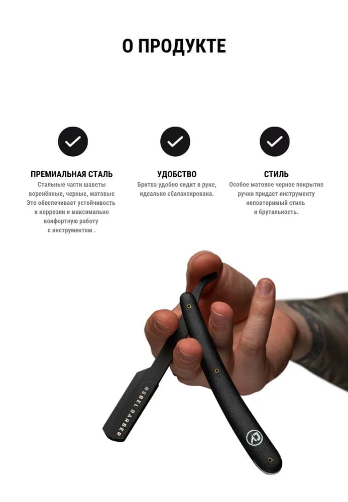 Шавет REBEL BARBER - это прекрасно разработанный, незаменимый инструмент для желающих действительно испытать удовольствие от традиционного влажного бритья. Удобно сидит в руке, идеально сбалансирована. Для домашнего и профессионального использования.